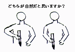 やはり字を書くのですから、自然な姿勢、長時間書いていても疲れない姿勢が大切だと思います。その意味では、右の図のどちらが適していると思われますか? 私は、右の方が自然だと考えます。私たちが適度な高さの机に向かって、硬筆筆記具で字を書く姿勢も右ではないでしょうか。私は、毛筆で字を書くときも基本的には同じなのではないかと考えています。合理的な方法で、学習すべきだ言い換えることもできるでしょう。