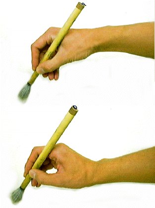 まず、持ち方については、右の写真のように考えられます。いわゆる正しい持ち方(写真下)で持った場合、手首が下がり肘が上がることがありません。それに対し、筆管が親指と人差し指の間に入る持ち方(写真上)だと、手首が持ち上がり、必然的に肘が上がってしまうことになります。もし、この持ち方で手首が持ち上がっていない場合は、筆管の傾きをチェックして下さい。毛筆を習いはじめたばかりの子供で、筆管を傾けて妙に太い線を引いている場合も、ここに原因があったりするのです。