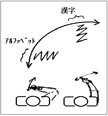 次に、机の高さをチェックする必要があります。右図をご覧下さい。漢字書字の場合、基本運動であるZ型運動のためには、アルファベット書字の場合より、もともと机が低い方が望ましいのではないかと、筆者は考えています。さらに硬筆に比べ毛筆の場合は、指先から紙面への距離が長くなります。したがって、高めの机を使った場合、どうしても肘が上がりがちです。筆先の位置が手前に近づくにしたがって、肘が上がるような時は、机の高さを疑ってみると良いかと思われます。