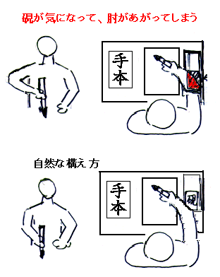繰り返しますが、芸術的な書の作品を書く場合はこの限りではありません。ですから、塾などで書家の卵を養成する場合などは、肘をあげた書き方を教えるのも誤りとは言えませんし、それが書きやすいという人を無理に矯正させる必要もないと思います。一方、義務教育では、この問題は大事ではないかと思っています。というのは、現在の国語科書写の目標は、原則的には<実用のため>といっても良いと思います。とすれば、毛筆で学習した内容が硬筆にも生きるものであって欲しいと思います。ですから、毛筆の学習を特殊なものと位置づけるのではなく、自然に硬筆とつながるものであって欲しいと思うわけです。その意味からも、硬筆筆記具で書くときの構え方、上の図では右側の構え方で、毛筆学習もおこなうべきではないかと思うのです。