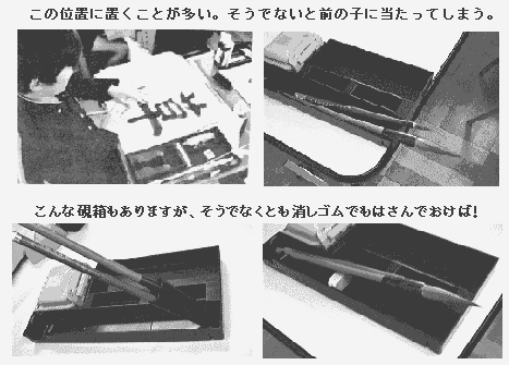 もう一つ関連して気になることがあります。これは、小学校などで一度でも毛筆書写の指導を担当されたかたならおわかりのことと思います。次ページの写真右上のように、肘を汚さないように硯をぎりぎりに前におくと、今度は前の児童の肘に筆が当たってしまうという問題がおきます。皆さんも子供の頃、肘で後ろの子の筆を落としてしまい、自分は長袖シャツを黒くしたという経験がないでしょうか? これを防ぐために、小学校の先生がたは前図の斜線の位置に硯を置くよう指示しがちです。写真左上は、ある県の書写教育研究会の資料から抜粋した写真です。この県は、大変書写指導において進んでいる県です。しかし、肘・そでの位置に硯があります。さて、どう指導しますか? 肘を上げさせる? それとも、前の子の肘が当たっても気にしない?? 本来の解決方法は、教室を広くする、いち教室の子供の数を減らすというのがもっとも適切な方法かも知れません。小学生用の習字セットにもいろいろな工夫が凝らされたものがあります。写真右上のものは、どうしても肘があがってしまう位置に硯が来てしまいます。それに比べて下のものはその心配がありませんね。もし、上のような場合でも、すり減った消しゴムなどを、筆の下の方に挟むなどすれば対応できますから、心配はいりません。ちなみに写真左上の学校でも、こういった工夫をしていることがうかがえます。