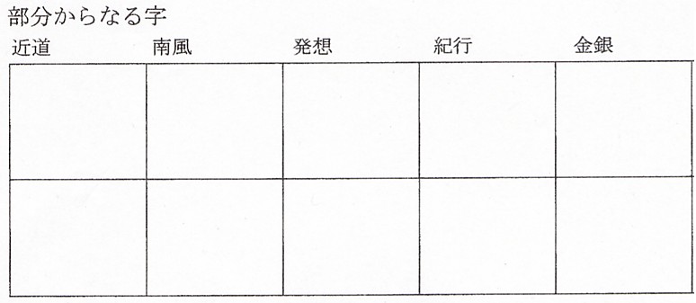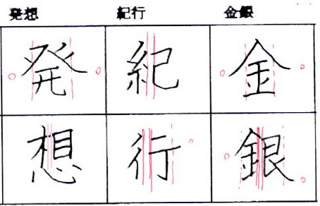 それでは、みなさん自身が試し書きした字を確認してみてください。「金銀」は上の図を参考に、「金」という字の形の取り方、一画強調部分を切り落とすというイメージがわかりますでしょうか? また「紀行」という字の「糸」、これを糸へんにする字形の変化に関しては、大人でもなかなかできていない人が多いように思われます。また主観的に見ると、最近の若い人でぎょうにんべんの形の取り方がうまくいっていない人もいるように思えます。さあ確認してみてください。