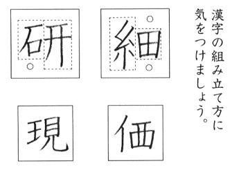 この図はある教科書から持ってきました。「研」「細」という字に関しては答えが示されています。そして「現」「価」という字についてはお手本が示されています。このようにお手本が示されていればその形の取り方考えてみることができますね。