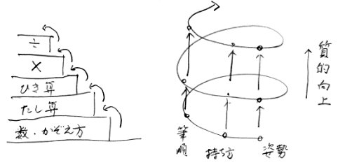 この図の出典、最初に書かれていたのが何であったか失念してしまいましたが、良く引用されている図です。算数の場合は、数の数え方をしっかり身につけた上で、初めて足し算の勉強に進み、足し算が理解できたことを前提として引き算に進みます。このように階段を一段一段しっかり踏みしめながら上っていくカリキュラムと言えるのではないでしょうか。もし、算数科教育学などを専攻する人で違っていたら是非指摘して下さい。一方、書写の場合は、螺旋構造のカリキュラムと考えられます。