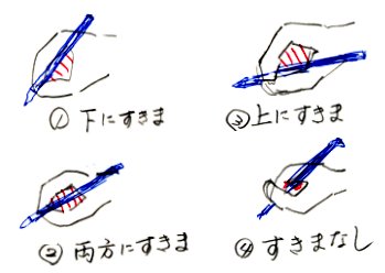 たとえば、図の持ち方であれば、いわゆる正しい持ち方、すなわちこの図の@の持ち方ができる子供、いえ大人も少なくなっているといわれます。一度持ち方を教え、違っている場合に注意しただけでは、どうしても直らなかったりします。その意味でも、繰り返し学習することが必要なわけですね。なお、持ち方に関しては、テキスト14ページに載っていますので、気になる人はそこを参照してみて下さい。さらに、なぜ@の持ち方が正しいのかといったことについては、「書道概説」の授業もしくはインターネット「筆記具の持ち方と姿勢」を参照してみて下さい。
