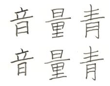 その他の問題を見ておきましょう。この図の上の段の「音」や「青」という字を見てみてください。前の時間にお話しした、長さをそろえ一画強調するということを、これら上下からなる字に当てはめてみました。しかし残念ながら、上の段の「音」を「青」も、どちらもなんだか日の部分と月の部分が大きすぎるように感じられます。