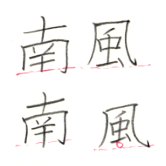 次は、構えとその内側からなる字をあげてみました。上と下の「南風」という字、なにから違和感はないでしょうか? 私は上の段の「風」という字だけが、なんだか違和感を持って感じられます。どうも「風」という字は、外側の構えよりも内側の部分を少し上にあげて形作ると良いように思われます。これはどうしてでしょう? 南という字は真ん中の縦画が少しくらいはみ出ていても、それほど違和感を感じません。おわかりですね、先ほどの理論と同じように、「南」という字であれば、下部がいずれも縦画であるのに対し、「風」は横画です。だからそこには少し隙間を取ってやると、バランスよく見えるということではないでしょうか。試し書きはしてもらっていませんが、「間」という字の「日」の位置にも応用できるはずです。門構えに比べて、内側の「日」を少し上ぎみに書くと、バランスよく見えるということになります。