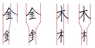 では前の時間にお話しした、長さをそろえ一画強調ということ、このことは上下からなる字には使えないのでしょうか? どうも日や月などは上の横学よりも少し狭くした方がよいようです。これには汎用的な理論というのはないのでしょうか? もう一度、扁と旁からなる字の説明の図を見直してみてください。今度は図を横にしてみたらどうでしょうか。おわかりですか? 日などにくらべ、横画が水平線でできている部分は、少し内側に書いてやるとそろって見えるということのようです。先ほどの理論がここにも応用できそうです。これについても詳しいことは、インターネット「仮説-字形感覚の原理-」を、参照してみてください。
