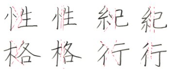 先ほど試し書きしてもらった文字でいうと「性格」「紀行」の二つの熟語がありますが、これがこの図のようになっているかどうか、自分の字を確認してみてください。なおなぜこのようになるのかという考察については、インターネットの「扁と旁の大きさと位置」を読んでみてください。