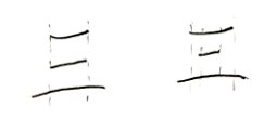 実はこのどちらで書いても全く問題はありません。どちらも正しい字です。ただし、書写指導上どちらがより望ましいかという点では、少し考えてみる必要があるのです。試しに書道の「書」という字を書いてみて下さい。「三」は非常に単純な構造の字ですし、おそらく「三」という字の横画のバランスが、難しい、整えにくいとは感じないのではないでしょうか。それに対して、「書」という字はたくさん横画がありますね。そして、このたくさんの横画の長さのバランスについて、自信があるでしょうか?