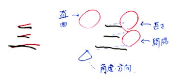 まだまだ実感としてわかないかも知れませんね。先ほど皆さんには、「三」「書」という字を書いてもらいました。そして、横画の長さについて比較しました。これが、この図における比較、そして学習内容の把握と考えたら少しわかってもらえるでしょうか。