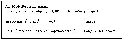 書字能力は、一般的に書かれた文字の字形の品質、および速度などから評価されます。この実験では、このうち、字形の品質を使用します。 個人の字形の習得および実際的な運用のモデルを、図4のように定義しました。このモデルは、認知科学や脳研究によって修正されるべきものです。 さらに、書字のための記憶は、私たちの書字に対するメタ認知および現在の脳研究、特に特に小脳の機能の研究、の結果から、視覚性記憶および運動性記憶力(認識するための記憶と書くための記憶)に分割すべきかもしれません。 しかしながら、本研究の段階では、2つのタイプの記憶は簡略化のために分割せずに取り扱います。