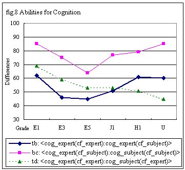 この問題は、認識と関連するため、認識に関するグラフを図8に示します。tb(太い実線)は図7と同じデータです。bcとtdは、いずれも、エキスパートの認識と被験者の認識の差を示し、bcの認識対象は被験自身の字形であり、tdの認識対象はエキスパートの字形です。私たちはこの結果を興味深く思います。その一つは、エキスパートと被験者の認識能力(bc)の差が、書字能力の差(tb)より大きいことが、前の結果と一致する点です。もう一つの点は、2つの値はその対象とするものにより、特有の違いを示すことです。エキスパートの字形を対象とした認識結果は、すべての学年において、被験者自身の字形を対象とした認識結果より良い値を示しますが、グラフの形状は、小学校5年生・中学校1年生から、非常に異なるのです。エキスパートによって書かれた字形を正確に把握する能力は大学生まで改善していますが、自身が書いた字形を把握する能力は悪くなります。この結果から得られた第1のポイントは、概形選択能力による誤差がありますが、この方法は、相対的な使用においては有効であろうとということです。 次のポイントは、字形の質が示されたグラフ(tb)、およびそれらの字形の認識能力が示されたグラフ(bc)が、近似することから、この結果が教育にとって有用だろうということです。 日常生活における書字を向上されるための書写教育は、日本の学校教育において中学校以後にほとんど実行されません。 もちろん、この結果を教育に応用するためには、追試が必要です。