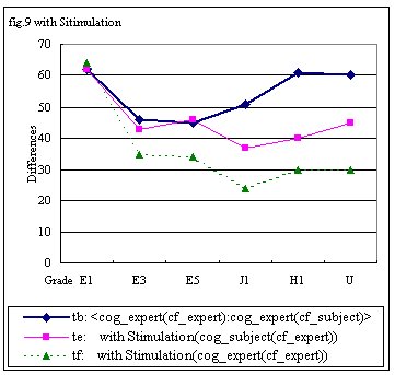 被験者に刺激をあたえた際の、字形への影響は図9で示されます。 tb(太い実線)は刺激なしの場合を示し、te(細い実線)は被験者がエキスパートの字形から選んだ概形が刺激として与えられた場合を示し、tf(細い点線)はエキスパートがエキスパートの字形から選んだ概形が刺激として与えられた場合を示します。 エキスパートの字形は刺激としてteおよびtfの両方に与えられますが、それらは認識(概形選択能力を含む)の要素を含むか含まないかが違っています。したがって、tbとteの間の差は、自分の記憶によってのみ書かれた字形とエキスパートの字形を参照して書かれた字形の違いを示し、teとtfの間の差は、認識(概形選択能力を含む)の不足を補った場合の字形の品質の差を示します。 単に記憶のみによる字形の悪化(個性化が含まれる)は、大学生まで進みますが、適切な字形が示されることによる字形を学習する能力は増加しています。