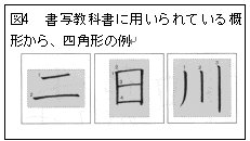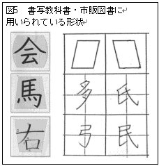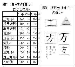 現行の小学校書写教科書*66社における概形に関する指示の頻度を、学年・形状別に示したものが表1である。1年生の初期の段階では、正方形および縦長横長の長方形などの四角形が多く見られ、徐々に他の形状が見られるようになる。また図3より、同じもしくは字形の似ている字種に対し、異なる形状が当てはめられていることがわかる。
