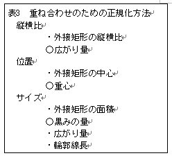 正規化の方法としては、表3に示す組み合わせ2×2×4=16通りを試行し、主観評価にもっとも合う結果となった表中の丸印を付したものを使用した。差異の計算方法としては、単純な重ね合わせによるハミング距離、輪郭特徴のDP matchingを用いて、文字と各形状との距離を計算し、最も近いものを選択するというハイブリッドタイプとした。ハミング距離による方法は、すでに山崎ら*10に見られるものである。なお、ハイブリッドタイプとした理由は、主観評価との比較において、どちらか一方では適切な結果が得られなかったことによる。人間の主観では、重ね合わせて考える場合と、角の存在に着目する場合とがあり、字種により重視される部分が異なるのではないかと予想される。今後の研究課題である。