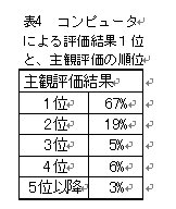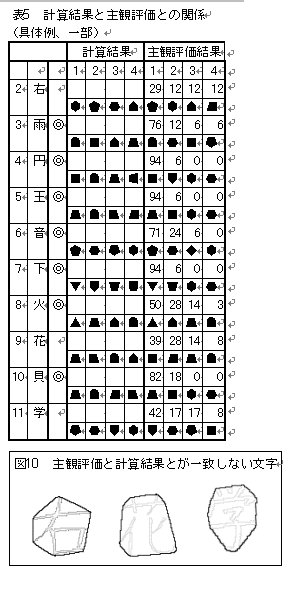 表5は、冒頭の10文字について、計算結果と主観評価それぞれ4位まで示したものである。全体の比率と同じく、「雨・円・王・音・下・火・貝」の7文字は、計算結果と主観評価とが一致している。