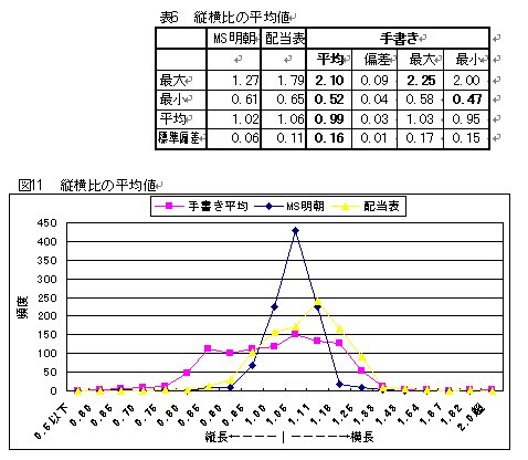 文字に外接する矩形の高さを1とした際の横の比率を縦横比として計算をおこなった。表6に、明朝・配当表・手書き(全教科書の平均)についての平均値等を示した。比率的には、手書き<明朝<配当表の順で縦長であることがわかる。特に注目すべきは、最大・最小値の幅と標準偏差である。手書き>配当表>明朝の順でばらつきが大きい。このことは図11のグラフからも読みとれる。明朝が大きなピークを挟んで急角度で対称的なグラフを描くのに対し、配当表はかなりなめらかで特に横長方向への分布が多く見られる。それに対し、手書きの場合、0.8から1.15まで比較的フラットな分布を示し、字種により縦横比に差があることが顕著である。配当表と比べた場合、縦長の字形がかなり存在することがわかる。