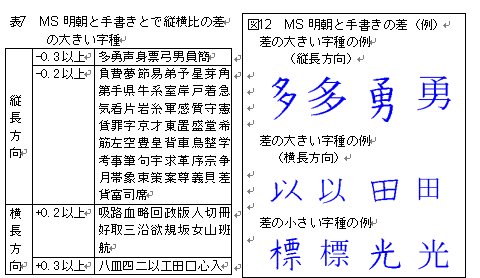 このように手書き文字と、印刷用字形とでは縦横比に差異があることが確認できる。特に明朝体と手書きとで縦横比に差が大きい字種について、表7に示すと共に図12にその例を載せた。