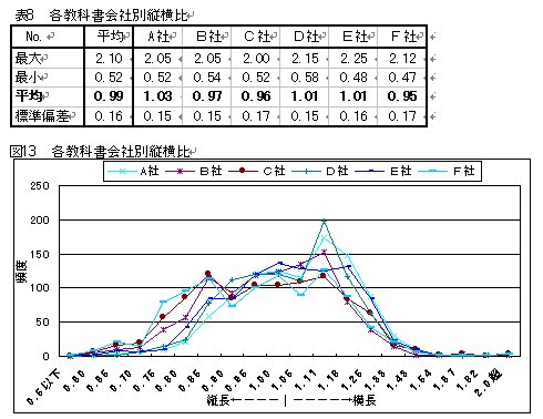 各教科書会社別に縦横比を見た場合、表8のように平均値からある程度のばらつきがあることがわかる。また図13から、F社は縦長ぎみに、A社は横長気味に分布していることが読みとれる。また同じ平均値を示すD社とE社でも、ピークを持つD社に対し、平均的な分布をなめらかに示すE社とでは異なることがわかる。