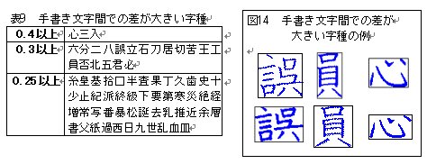 このように分布だけを見た場合、比較的一定の縦横比を示すように思われるが、字種別に見ると同じ字種でかなりの縦横比の差が見られる。差が大きい傾向にある字種を表9に、その例を図14 に示す。