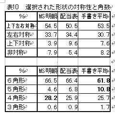 多く分布した形状にどのような特徴があるのか、形状の角の数と対称性とを集計したものが、表10である。対称については、明朝において上下対称の形状が他に比べて少ない程度である。角の数については手書きにおいて明朝体等より5角形が多く選択されているという傾向が見られる。