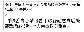 次に、明朝と手書きの字形をそれぞれ多角形近似した上、重ね合わせ、その類似度を測定した。測定方法は形状の分類と同様の方法である。この結果から、明朝と手書きとでその概形に差が大きい字種30字種を表11に示す。