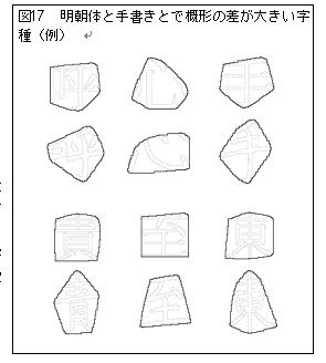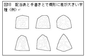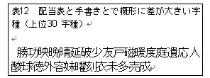 同様に、配当表と手書きとでその形状に差が大きい字種30字種を表12に示すと共に、その例として3字種を図18に載せた。左右の部分形の組み合わせ方による違いの他、払いや「成」の4画目などの特徴的な画の長さの強調などがその理由となっている。