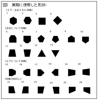 なお、これらの形状の選択には、実験段階において約40種の形状を試行した。それぞれの角度、言い換えるなら台形における上辺・下辺の比率などについては、任意に設定した形状を主観調査(後述)との関係から実験を繰り返すことで設定した。実際に使用した形状を図6に示す。