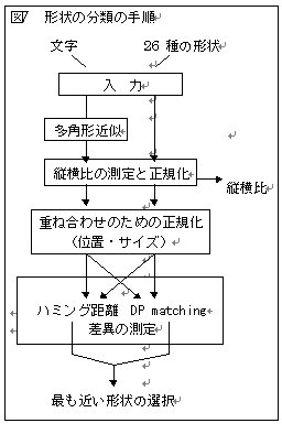 方法は図7のとおりである。文字・形状それぞれを入力し、文字のみ輪郭の多角形近似をおこなう。まず縦横比を測定した後、縦横比を一定にする。次に重ね合わせのため、位置・サイズを正規化する。その後、差異の測定をおこない最も近い形状を選択する。