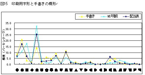 概形特徴の分類をおこない、分類された字種の数を図15に示す。配当表と手書きとは、似た概形が多く選ばれていることがわかる。また明朝体は、長方形に分類される字種が多く、印刷用字形として詰めた際に整然としていなければならない必要性がうかがわれる。