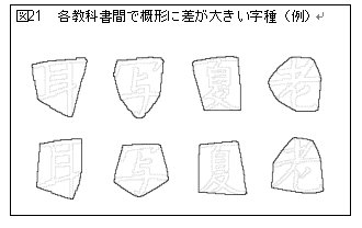 ここで、手書きの字形どうしを重ね合わせ、形状の分類と同様の方法でその類似度を測定した。すなわち、6社総当たりで1字種当たり15回、計15075回の計算をおこなった。各教科書間で概形に差が大きかった字種上位30字種を表14に示すと共に、その一部を例として図21に載せた。明朝と手書きとで差の大きい字種では、左右の部分形から構成される字が多くを占めたが、手書き相互の場合、横画もしくは冠、さらに払い等のいわゆる一画強調をどこでおこなうかといった問題に起因していることが読みとれる。このように規範とされる字形であっても、その形状にばらつきがあることを理解しておく必要があると考える。