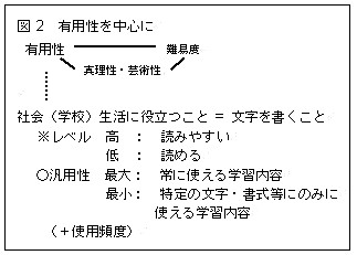 図 1を書写学習に当てはめ、図 2のように有用性を考えることとする。書写学習における有用性は、前述のとおり、文字を書くことそれ自体であり、社会(学校)生活において不可欠である。目標とするレベルは、最低限読めることであり、高い方は読みやすい文字を生成できることとなる。