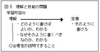 平成元年度および平成10年度学習指導要領3・*6において、国語科の学力は、国語への関心・意欲・態度、表現能力・理解能力、言語についての知識・理解・技能としてとらえられる。このうち書写の学力は、言語事項に分類され、「〜書くこと」という語尾からも、「言語についての技能」に分類するのが自然である。しかし書写において、「技能」のみに着目し、他の関心・意欲・態度・知識・理解等を無視することはできないはずである。この内、「理解」については、学習指導要領でわずかに触れられているに過ぎない。とはいえ、書写もその学習内容について「理解」した上で、それを実現できるようするための練習をへて、「技能」として定着させていく必要があることは、松本*7や平形2が述べているとおりである。そのためには、図 5に示すとおり、指導する側・教材としての教科書等において、理解させるべき内容の合理性が明確になっている必要がある。より明確な理解内容をもった内容を基礎基本として重視し、不足なく合理性を明確にするための書写教育研究をおこなわなければならない。