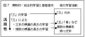 このように考えたとき、仮に、ある手本である文字を学習したとして、その文字だけに使える学力であっては、書写に限定されない学習活動において、書写学習の力を生かす活動は極めて難しい。その文字が、その活動によって書かれるとは限らないからである。一方、汎用性の高い内容を学習した場合、これを他の文字に生かすことができるはずであり、図 7に示すとおりである。久米8の「手本を習う から 手本で学ぶ」という考え方とも合致する。教育実践の場における総合的・横断的授業の実践のためには、汎用性を持つ内容の学習とともに、その学習内容を常に生かしていく意識の学習(その方策)が重要であると考える。このように、書写学習の能力を生かすための学習、横断的・総合的な学習、書写と国語科他領域との関連学習において、汎用性のある学習内容を基礎基本として重視する必要があり、それは自己学習力とも関連してくる。