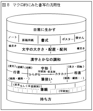 まずマクロ的な見方として、図 8を提示する。先に述べたように「持ち方」は、すべての書字活動に必要な内容であり汎用性が高い。「筆使い(もしくは基本点画)」は、横画が1006字中の938字に含まれてことなどをみても、各学習内容がかなりの汎用性を持つことがわかる。また多くの書字場面で、「漢字とかなの調和」は必要となる。「文字の大きさ・配置配列」は縦書き・横書きが異なる部分があるものの、汎用性が高い。また、書式については、その書式ごとに考える必要もあろう。日常の書字活動に対し、輪切りされた学習内容が縦方向にどれだけ分割され、どれだけの面積を持つかという形で汎用性をとらえるものである。図 8は、内容の多少・効果から厚みをプラスすることで、有用性を体積としてとらえることもできる。