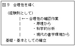 書写指導の内容としての合理性の導き方として、字形また間架結構法などの古典的経験則を、現代的解釈により合理性を確認する作業をへて、基礎基本として確立させていくという考え方ができる。これを、図 9に示す。