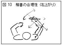 まず、書字習慣の長い伝統の中で淘汰され形成されてきた形・特徴は、何らかの合理性を持つはずである。平形2は、「規範とされる文字の形そのものが、知的関心を高めるに十分な文化的で価値ある創造物である」と述べている。正書体の変遷をみると、篆書・隷書が数百年ほどで次の書体へと実用書体の地位を譲っているのに対し、楷書が現在少なくとも1600年ほど基本的な特徴を変えることなく使われ続けているのも、何らかの合理的特徴を持っているからであろうと思われる。たとえば、楷書の全体的な特徴である横画の右上がりなどは、図 10に示す手指の運動の容易さに起因していると考えて間違いなかろう。また、汎用性の考察の中で述べたように、間架結構法などであっても法則化・原理としてとらえられる内容は、合理性を示唆する可能性があるはずである。