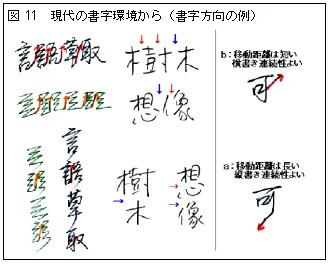 それらの字形、そこから抽出された結構法などの既存の知識について、科学的分析および解釈により、ある程度の普遍性を持った合理性を確認する作業が考えられる。また、その時代の書字環境によっては、蓄積された経験則等が必ずしも合理性を有するとは限らない。変化した部分の是正・対策も必要である。たとえば、縦書きから横書きへの移行とそれによって生じる変化の例を、図 11に示した。Z型運動の中断、左右の部分形からなる文字が約4割(学年別漢字配当表1006字中)をしめることとまとまりの問題、書字方向とそれに適した筆順の問題*20などである。もちろん、字体や筆順などそれ自体は、書写教育研究の範疇を越えるわけであるが、それらを踏まえた合理性の明確化が必要であると思われる。