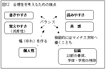 の二点と考えられる。前者はある程度常識の範囲内としても、後者の合理性については字体識別上の問題(読みやすさ)、美感など何らかの説明と検証が必要かと思われる。
