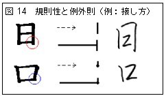 主たる規則と例外則との整理について、例をあげ考察する。宮澤1が「文字生成過程の休止点」、平形が「空間的要素と時間的要素」の説明の一例として、「口」と「日・田」とで接し方が区別されることを述べている。これについて、次のように解釈し記述することができる。