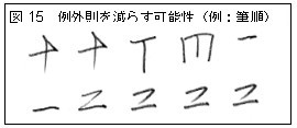 「本書の筆順の原則」における矛盾は、解説を参照することにより例外則であることがわかる。筆順については、早い時期に久米*28によって「例外的な考え方」の問題点が指摘され、「筆順原則表(試案)」が示されている。このような例外則をより少なくする工夫について、その後研究が大きな広がりを見せていない点で残念である。また図 15に示す押木ら*29の+型運動・Z型運動の研究から、「+型運動の優先」と「部分形におけるZ型による終了」などの観点からも検討されて良い問題だと考える。