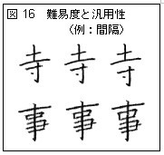 書字される字形の品質などにおいて、より高いレベルを求めた場合、難易度が上がり汎用性も下がる可能性がある。例として、「複数の横画の間隔」を考える。学習内容は「複数の横画間の間隔は等しく書く」と記述できる。汎用性は高く、合理性も常識の範囲内で検証の必要も低いと思われる。一方、これを横画のみでなく口形などにも適用させていくことも考えられる。ただし、人間の通常の書字活動において、厳密な意味で等間隔に書くことは難しいはずであり、図 16のように多少広すぎたり狭すぎたりすることは十分あり得る。「寺」の「土」と「寸」の間隔、「事」の「口」部と他の横画の間隔について着目したとき、前者は狭い方が、後者は「口」部の広い方がより自然に感じられ、書写教科書のいわゆる手本類にもこの傾向が見られる。規則性を考えると、「閉空間は、開空間より広めに書く」ことになり、この理由としては抽象論ではあるが森*30の「囲まれた空間は重く強く感じ」られることなどがあげられる。