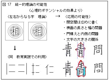これまで、字形について合理的に説明された例として、平形*31による、左右の部分形のバランスについての心理的ポテンシャル効果の考え方が、非常にわかりやすい。図 17左上の図のように、押木ら*32によってある程度の適用可能性が示されている。また、1/r2の考え方自体は小中学校での指導に適さないとは言え、図 17左下のように、「縦画や斜めの画が上・下に出るときは高く、横画が上・下になるときは低く書きましょう」といった形で、小中学校での教育実践にも使用可能である。