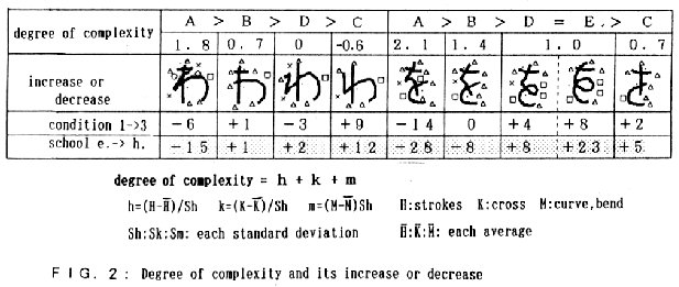 In questi modelli si e calcolato il grado di complessita in base ai criteri di Kabashina(fig.2).Lalettera(A)e utilizzata come modello standard per ogni carattere,con un elevato grado di complessita. Nella fig.2 si puo notare che la complessita diminuisce con l'aumento della scolarizzazione dalle scuole elementari alle superiori,con una progressiva semplificazione del tracciato. Attraverso l'esame di questa evoluzione,si puo studiare la validita dei modelli delle lettere ed i cambiamenti che intervengono con il passare degli anni.Per conoscere la personalita di ogni studente e necessario prendere in esame l'evoluzione della scrittura.