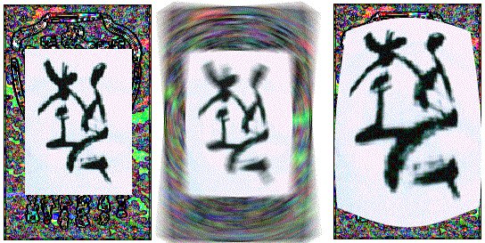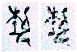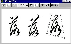 こういったことは、難しいのでしょうか? もちろん、自分のイメージに合致した作品・素晴らしい作品を作り上げるのは難しいことです。しかし、処理自体は決して難しいことではありません。半紙に書いた文字でちょっと遊んでみることにします。図は、イメージスキャナで入力した文字に、クリスタルという変形を施しています。